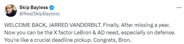 如今时隔359天,范德比尔特终于伤愈复出,对于彪哥的复出,名嘴Skip发推写道:欢迎回来,范德比尔特。缺席了一年后你终于复出了。现在你可以成为詹姆斯和浓眉所需要的X因素,尤其是在防守方面。你就像是一个交易截止日前的关键收获。恭喜你,勒布朗!