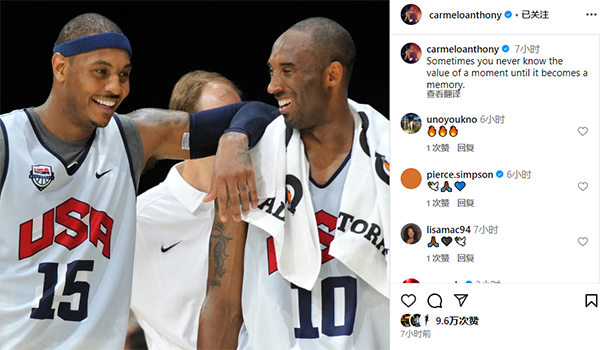 NBA名宿卡梅隆-安东尼在社媒上晒出了自己和科比的合照,并写道:有时候,你永远不知道某个时刻的价值,直到那一刻成为回忆。