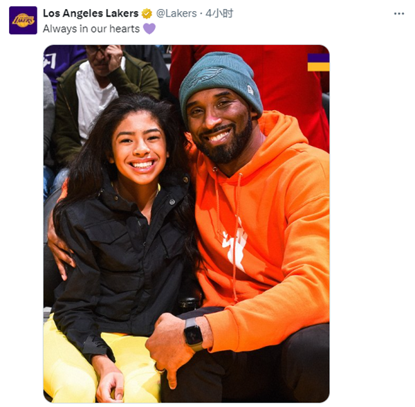 湖人官推晒出了科比和Gigi坐在场边看比赛的合照,并写道:永远在我们心中。