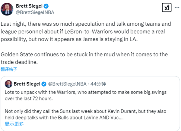 Brett Siegel报道称,昨晚,各球队和联盟工作人员纷纷猜测和议论勒布朗加盟勇士队是否真有可能,但现在看来詹姆斯会留在洛杉矶。在交易截止日(的运作方面),勇士的处境仍然很艰难。