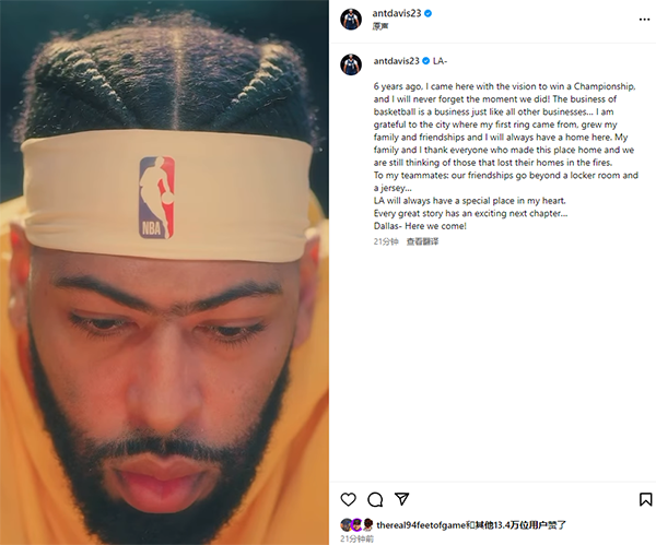 24直播网讯 北京时间2月4日,在湖人、独行侠和爵士三方大交易之后,安东尼-戴维斯首次发声,深情告别洛杉矶,却只字不提湖人,浓眉感谢洛杉矶以及致敬队友,却只字不提湖人。