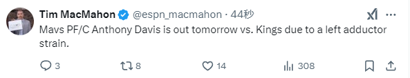 24直播网讯 北京时间2月10日,独行侠球星安东尼-戴维斯的伤情出炉,独行侠官方表示,浓眉因左内收肌拉伤将缺席明天与国王的比赛,恐因伤缺席全明星正赛。