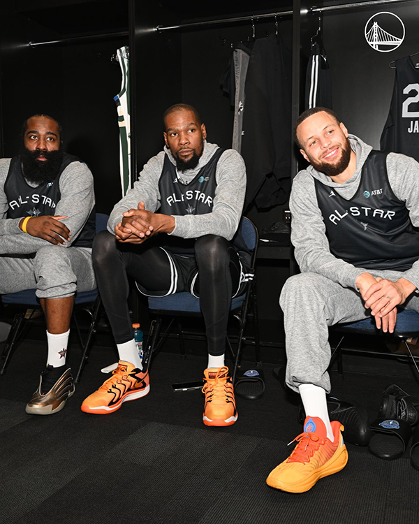 杜兰特、哈登、库里、利拉德和欧文等人PK超远三分,众人尝试纷纷打铁,库里率先命中又点燃球馆,之后利拉德也命中了;期间欧文投得太短,对此哈登咧嘴大笑,欧文也跟着笑了,不得不说,哈登和欧文的关系太好了。