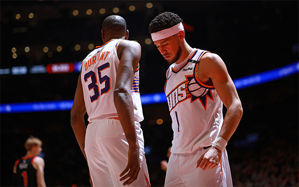 下半场,太阳第三节30-21追回9分,终于把比赛悬念打回来了;这一节布克再次主导进攻,单节8中4轰下12分,三节打完比尔得分也突破20分,但杜兰特单节6中1、三分4中0仅仅贡献3分,进攻端就像丢了死神镰刀似的,但防守表现出色。