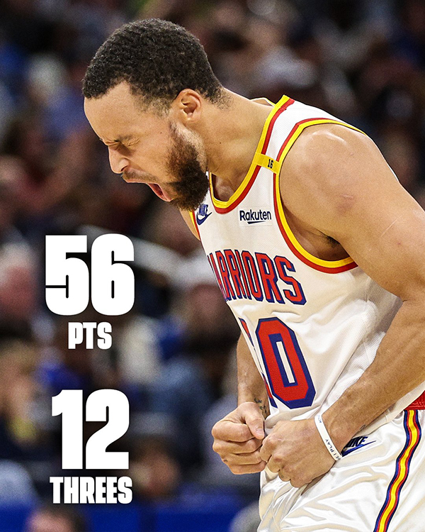 12、库里生涯第3次单场至少命中12记三分,追平克莱-汤普森并列历史第一
