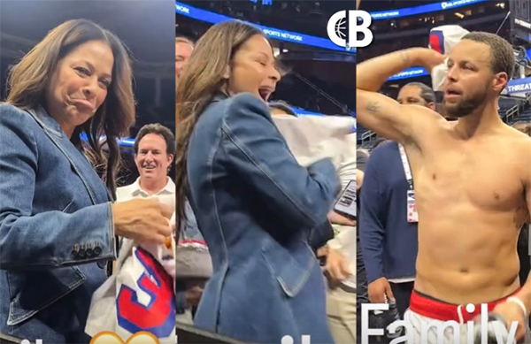 赛后库里获得比赛用球,与队友拥抱庆祝;离场时库里把自己的原味球衣送给自己的妈妈,然后赤膊离场返回更衣室。