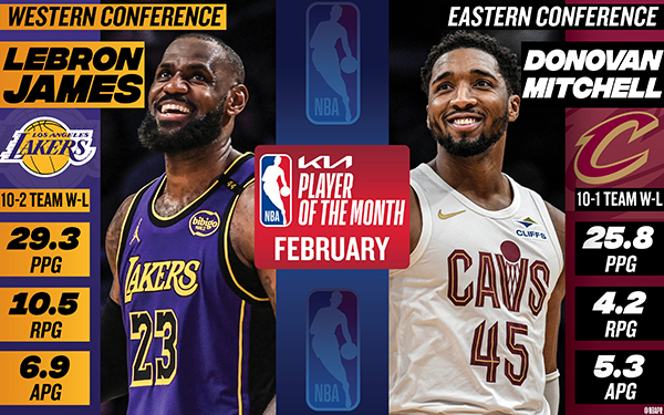 24直播网讯北京时间2025年3月5日,NBA官方公布了2月份的最佳奖项。湖人队的勒布朗·詹姆斯当选西部月最佳球员,这是他职业生涯第41次获得这一荣誉,刷新了NBA历史纪录。同时,骑士队的双星多诺万·米切尔和埃文·莫布里也分别荣获东部月最佳球员和东部月最佳防守球员。