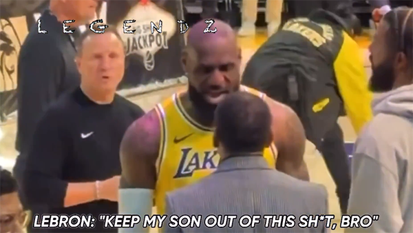 詹姆斯怒斥A-史密斯的一幕——詹姆斯坐在替补席休息,扭头看到站在一旁的A-史密斯,詹姆斯起身走到A-史密斯面前,面带怒气的詹姆斯对A-史密斯说:我不在乎,兄弟,别把我儿子牵扯进来。