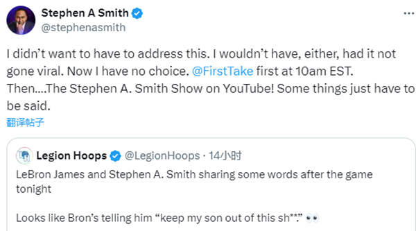 詹姆斯警告A-史密斯一事冲上全美热搜榜,A-史密斯先是发推回应:本来我不想谈论这个。如果这件事没有被广泛传播,我也不会谈论它;现在我别无选择,有些事你必须说出来。