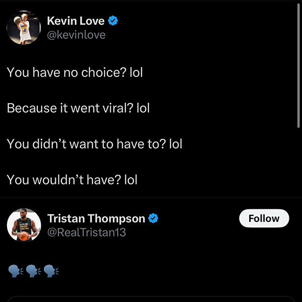 对于史密斯的言论,詹姆斯的前队友凯文-乐福回应道:你别无选择?哈哈!因为这件事在网络上疯传了?哈哈!你本来不想谈论?哈哈!你本来不会谈论?哈哈。