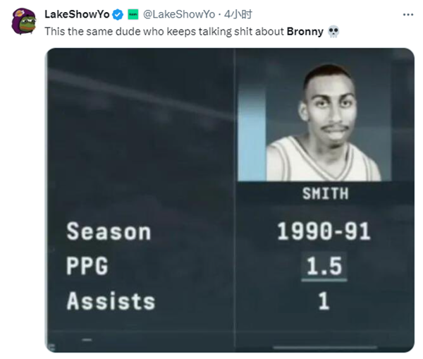 湖人自媒体晒出A-史密斯在1990-91赛季的数据,场均1.5分1助攻。