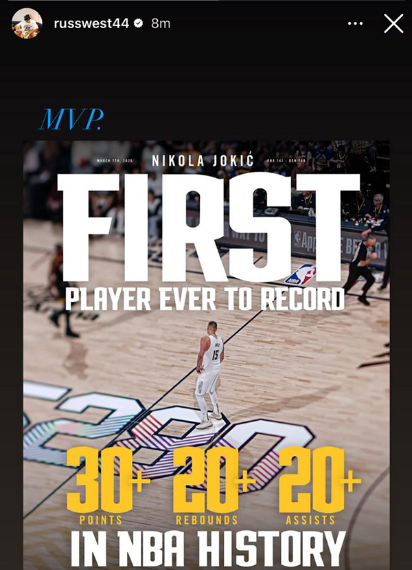 约基奇超神一战瞬间冲上全美热搜榜,威少在社媒上晒约基奇的神奇三双,配文写道:MVP!