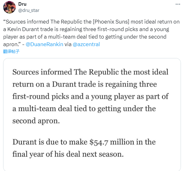 交易截止日前,多位记者报道,预计太阳将会在休赛期交易杜兰特,名记shams报道,太阳计划继续围绕布克建队;现在太阳记者报道,太阳想通过交易杜兰特换来三个首轮签和一个年轻球员。