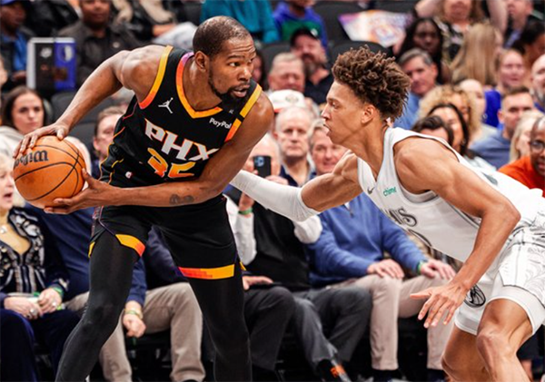 面对缺少浓眉、欧文等多名球员的独行侠残阵,第一节太阳32-24领先8分,杜兰特在组织进攻方面表现出色,首节拿到5分3篮板送出5次助攻。