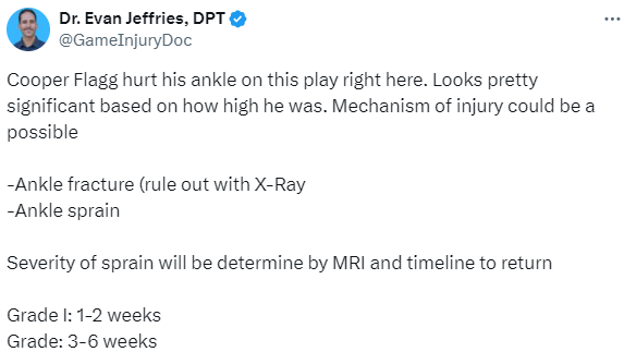 医学专家Evan Jeffries表示,弗拉格在这场比赛中脚踝受伤。从他的身高来看,伤势相当严重;X光检查排除了脚踝骨折,脚踝扭伤的严重程度将通过核磁共振来判定,一级扭伤休战1-2周,二级扭伤休战3-6周。