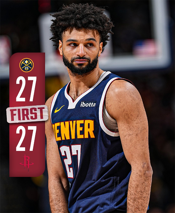 客场面对势头正盛的火箭,掘金4-13开场落后9分,随后掘金一波13-0瞬间反超比分,面对火箭的攻势,穆雷在进攻端火力全开,两队第一节打成27平,穆雷首节打满12分钟,10投5中独砍12分2助攻,扛起球队的进攻大旗。