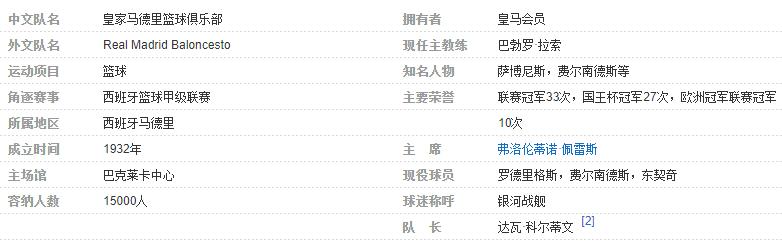皇家马德里篮球俱乐部与享誉足球界的“银河战舰”同出一源,成立于1932年,同时征战西班牙国内联赛、国王杯,欧洲篮球冠军联赛。相比于被国际足联评为“20世纪最佳足球俱乐部”的皇马足球队,篮球队的辉煌其实并不逊色多少。他们同样保持着西班牙国内联赛的夺冠纪录——建队78年收获33座国内联赛奖杯,期间有一次10连冠、一次7连冠,是篮球强国西班牙绝对的霸主。他们还保持着24次捧起国王杯的纪录,以及4次洲际杯冠军。