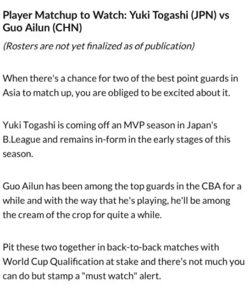 本届世界杯预选赛,在易建联不在的情况下,郭艾伦成为了中国男篮的领军人物,而在国际篮联发布的赛事预热信息中,也是将郭艾伦视为了本届男篮世界杯最受关注的控卫,值得一提的是,国际篮联还专门提到了日本男篮主力后卫富坚勇树和郭艾伦的对位,文章信息说道:“两位各自联赛里最好后卫将碰面,感到兴奋。富坚勇树是日本B联赛MVP,郭艾伦在CBA成为顶级后卫已经很长一段时间,以他打球的方式,将在很长一段时间成为精英,两人在背靠背比赛对位。”