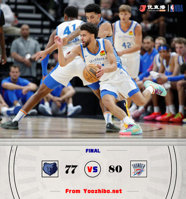 24直播网7月11日讯 NBA盐湖城夏季联赛灰熊对阵雷霆。开场后灰熊连续进攻内线,杰米森频频拿分,雷霆多点开花紧咬比分。第二节两队进攻端表现不佳,米切尔异军突起独得11分,灰熊在GG-杰克逊带领下和雷霆僵持不下,上半场结束时雷霆反超1分。下半场两队依旧打得十分胶着,第四节雷霆一度打出攻势将比分拉开,灰熊又顽强的将比分追上,小皮蓬错失绝平三分,最终雷霆80-77击败灰熊。