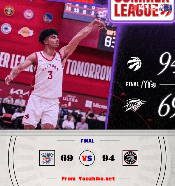 24直播网讯 7月14日讯 NBA夏季联赛,雷霆对阵猛龙。开场后猛龙打出10-1的开局,首节雷霆进攻手感不佳,猛龙单节建立起20分优势。第二节两队进攻效率都一般,猛龙没有给雷霆缩小分差的机会。易边再战,雷霆依靠弗拉格勒和琼斯的发挥将分差缩小到10分左右,迪克手感不佳频频打铁,不过第四节猛龙再次将比分拉开,最终猛龙94-69轻松击败雷霆。