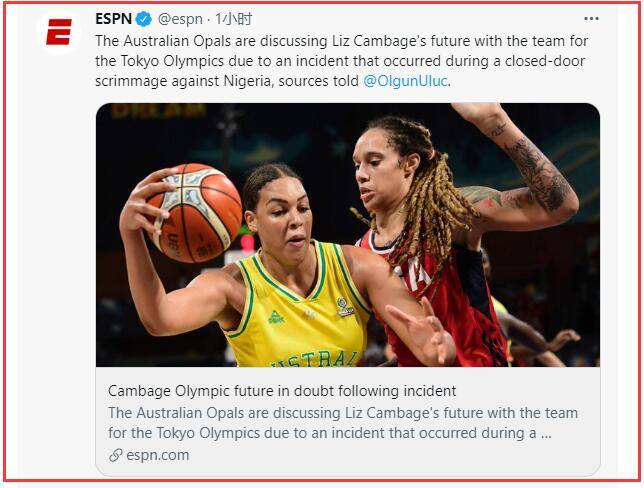 24直播网讯 京时间7月16日,据ESPN记者Olgun Uluc报道,澳大利亚教练组正在讨论是否将主力中锋坎佩奇驱逐出队,原因是她在近日一场对阵尼日利亚的封闭热身赛中发生了争执,同时,她在前段时间的队内封闭训练中,还违反球队纪律私自外出,这样的举动让球队上下非常不满,而澳大利亚教练组和篮协正在紧急商讨对于坎佩奇的处罚,最严重的结果,将会把她直接驱逐出队,不让她随队出征本届东京奥运会。
