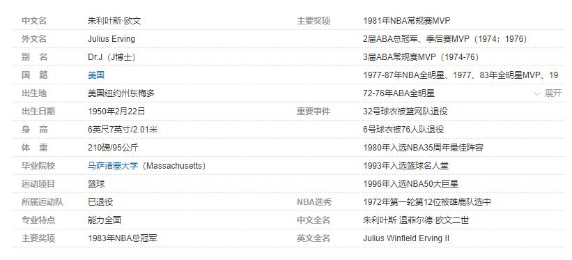 朱利叶斯·欧文(Julius Erving),1950年2月22日出生于美国纽约州东梅多(East Meadow, NY),前美国职业篮球运动员,司职小前锋,绰号“J博士”(Dr.J),开创了现代篮球在空中、篮筐之上表演的先河。