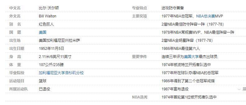 比尔·沃尔顿(Bill Walton),1952年11月5日出生于美国加利福尼亚州拉米萨(La Mesa,California),前美国职业篮球运动员,司职中锋,绰号“红色巨人”。