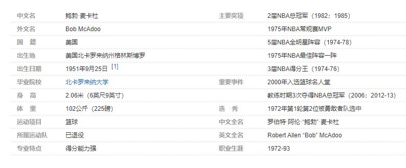 鲍勃·麦卡杜(Bob McAdoo),1951年9月25日出生于美国北卡罗来纳州格林斯博罗,前美国职业篮球运动员,司职前锋/中锋。