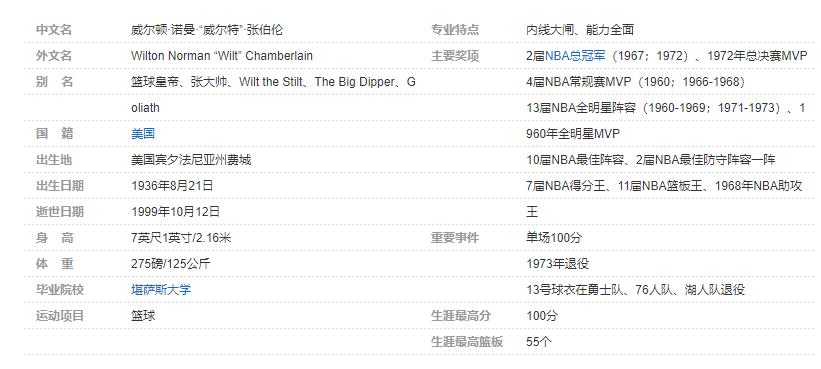 威尔特·张伯伦(Wilt Chamberlain,1936年8月21日-1999年10月12日),出生于美国宾夕法尼亚州费城,前美国职业篮球运动员,司职中锋。
