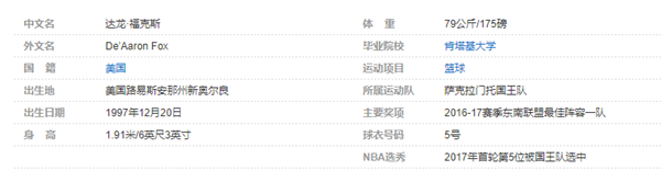 达龙-福克斯(De’Aaron Fox),1997年12月20日出生于美国路易斯安那州新奥尔良(New Orleans, Louisiana),美国职业篮球运动员,司职控球后卫,效力于NBA萨克拉门托国王队。2017年通过选秀进入NBA。