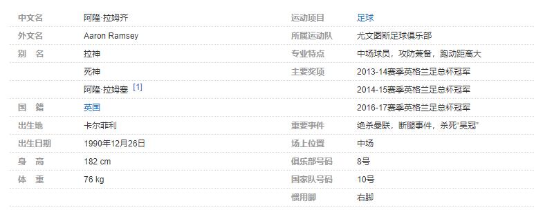 阿隆-拉姆齐(Aaron Ramsey),1990年12月26日出生于威尔士卡尔菲利,英国威尔士足球运动员,场上司职中场,现效力于意甲的尤文图斯足球俱乐部。