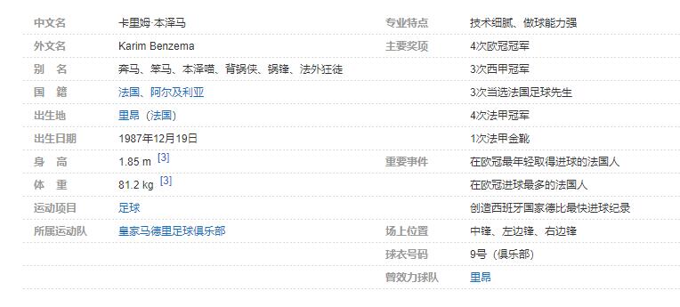 卡里姆-本泽马(Karim Benzema),1987年12月19日出生于法国里昂,法国足球运动员,场上司职前锋(中锋),效力于西甲皇家马德里足球俱乐部