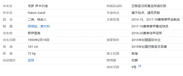 毛罗-伊卡尔迪(Mauro Icardi),全名毛罗·伊曼纽尔-伊卡尔迪-里维罗(Mauro Emanuel Icardi Rivero),1993年2月19日出生于阿根廷圣大非省的罗萨里奥,是拥有阿根廷和意大利双重国籍的足球运动员,场上司职前锋,效力于法国足球甲级联赛的巴黎圣日耳曼足球俱乐部。