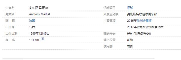 安东尼-马夏尔(Anthony Martial),1995年12月5日出生于法国埃松省的马西市, [1-2] 法国男子职业足球运动员, [3] 场上司职前锋,效力于英超曼彻斯特联足球俱乐部。
