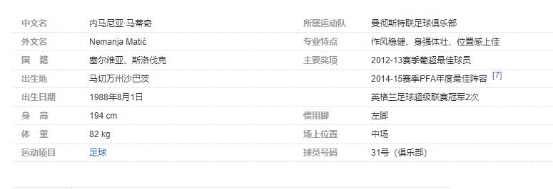 内马尼亚-马蒂奇(英语:Nemanja Matić/塞尔维亚语:Немања Матић),1988年8月1日出生于塞尔维亚马切万州沙巴茨,拥有塞尔维亚/斯洛伐克双重国籍, [1] 塞尔维亚男子职业足球运动员,司职中场,效力于英超曼彻斯特联足球俱乐部。
