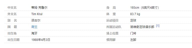蒂姆·克鲁尔(Tim Krul),1988年4月3日出生于海牙,荷兰足球运动员,司职门将。早在1996年就加入了海牙青训,2005年转投纽卡斯尔联的青训系统。这位荷兰前国门在各项赛事为纽卡斯尔联出场过157次,被租借给过福尔柯克、卡莱尔联、阿贾克斯和阿尔克马尔。2017年8月从纽卡斯尔联加盟布莱顿,2018年自由转会加盟英冠诺维奇俱乐部。