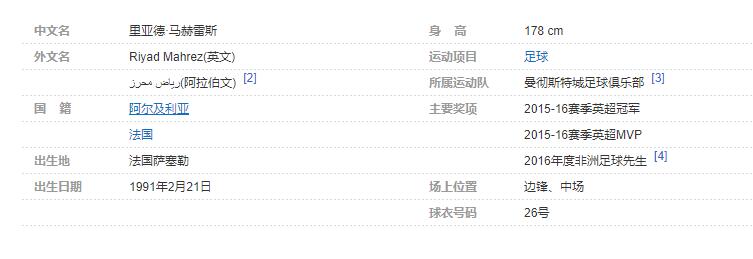里亚德·马赫雷斯(Riyad Mahrez),1991年2月21日出生于法国萨塞勒,拥有阿尔及利亚/法国双重国籍,阿尔及利亚职业足球运动员,司职边锋,亦可兼任中场,效力于英超的曼彻斯特城足球俱乐部。