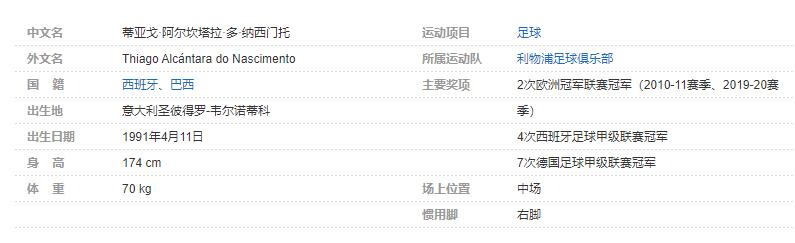蒂亚戈·阿尔坎塔拉·多·纳西门托(Thiago Alcántara do Nascimento),昵称蒂亚戈(Thiago),1991年4月11日出生于意大利圣彼得罗-韦尔诺蒂科,拥有西班牙/巴西双重国籍,西班牙足球运动员,场上司职中场,效力于英格兰足球超级联赛的利物浦足球俱乐部。