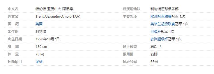 特伦特·亚历山大-阿诺德(Trent Alexander-Arnold),1998年10月7日出生于英格兰利物浦,英格兰足球运动员,场上司职右后卫,现效力于英格兰足球超级联赛的利物浦足球俱乐部。