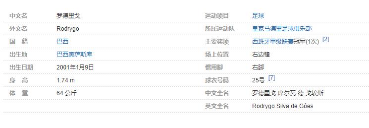 罗德里戈(Rodrygo),全名罗德里戈·席尔瓦·德·戈埃斯(Rodrygo Silva de Góes),2001年1月9日出生于巴西奥萨斯库,巴西足球运动员,司职右边锋,现效力于西班牙足球甲级联赛的皇家马德里足球俱乐部。