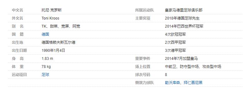 托尼·克罗斯(Toni Kroos),1990年1月4日出生于德国格赖夫斯瓦尔德,德国足球运动员,场上司职中场,现效力于西班牙足球甲级联赛的皇家马德里足球俱乐部。