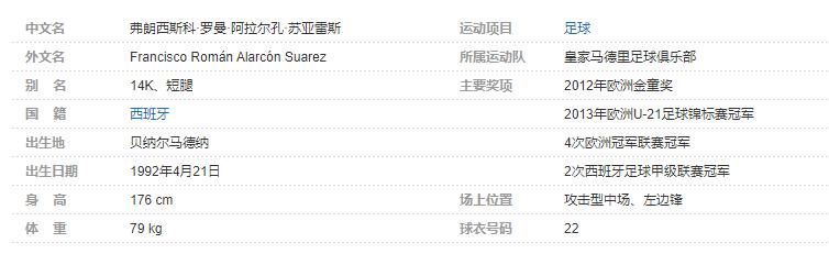 弗朗西斯科·罗曼·阿拉尔孔·苏亚雷斯(Francisco Román Alarcón Suarez),昵称伊斯科(Isco),1992年4月21日出生于西班牙的贝纳尔马德纳,西班牙足球运动员,场上司职前腰,现效力于西班牙足球甲级联赛的皇家马德里足球俱乐部。