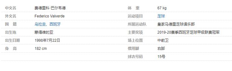 费德里科·巴尔韦德(Federico Valverde),全名费德里科·圣地亚哥·巴尔韦德·迪佩塔(Federico Santiago Valverde Dipetta),1998年7月22日出生于乌拉圭蒙得维的亚,拥有乌拉圭和西班牙双重国籍,场上司职中前卫,效力于西班牙足球甲级联赛的皇家马德里足球俱乐部。