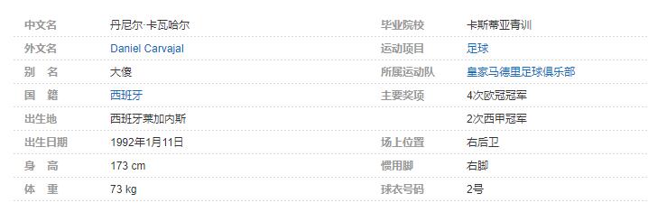 丹尼尔·卡瓦哈尔(Daniel Carvajal),全名丹尼尔·卡瓦哈尔·拉莫斯(Daniel Carvajal Ramos),1992年1月11日出生于西班牙莱加内斯,西班牙足球运动员,场上司职右后卫,现效力于西甲的皇家马德里足球俱乐部。