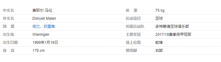 唐耶尔·马伦(Donyell Malen),1999年1月19日出生于荷兰,荷兰男子足球运动员。场上司职前锋,效力于德国的多特蒙德足球俱乐部。