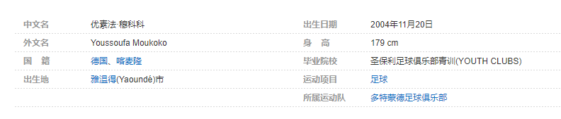优素法·穆科科(Youssoufa Moukoko),2004年11月20日出生于喀麦隆雅温得(Yaoundé)市,拥有德国和喀麦隆双重国籍,德国足球运动员,司职前锋,现效力于德甲的多特蒙德足球俱乐部。