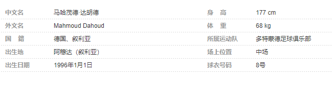 马哈茂德·达胡德(Mahmoud Dahoud),1996年1月1日出生于叙利亚阿穆达,德国足球运动员,场上司职中场,效力于多特蒙德足球俱乐部。