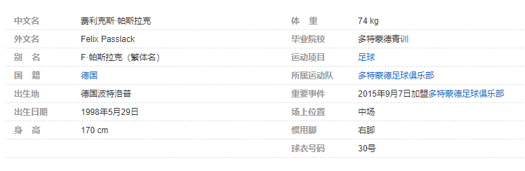 费利克斯·帕斯拉克(Felix Passlack),1998年5月29日出生于德国波特洛普,德国职业足球运动员,场上司职右后卫,现效力于德甲的多特蒙德足球俱乐部。