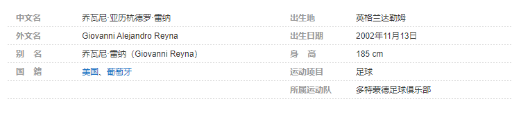 乔瓦尼·雷纳(Giovanni Reyna),全名乔瓦尼·亚历杭德罗·雷纳(Giovanni Alejandro Reyna),2002年11月13日出生于英格兰达勒姆,是一名美国职业足球运动员,场上司职中场,现在效力于德国足球甲级联赛的多特蒙德足球俱乐部 。
