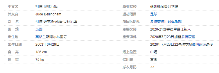 祖德·贝林厄姆(Jude Bellingham),2003年6月29日出生于英格兰斯陶尔布里奇,英格兰足球运动员,场上司职中场,现效力于德国足球甲级联赛的多特蒙德足球俱乐部 。